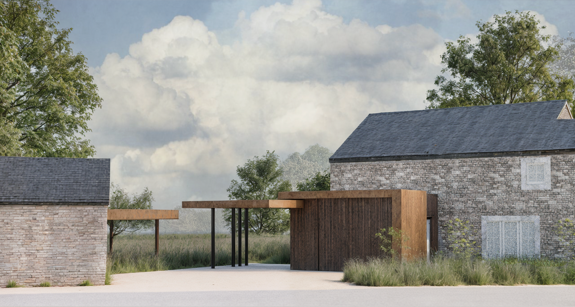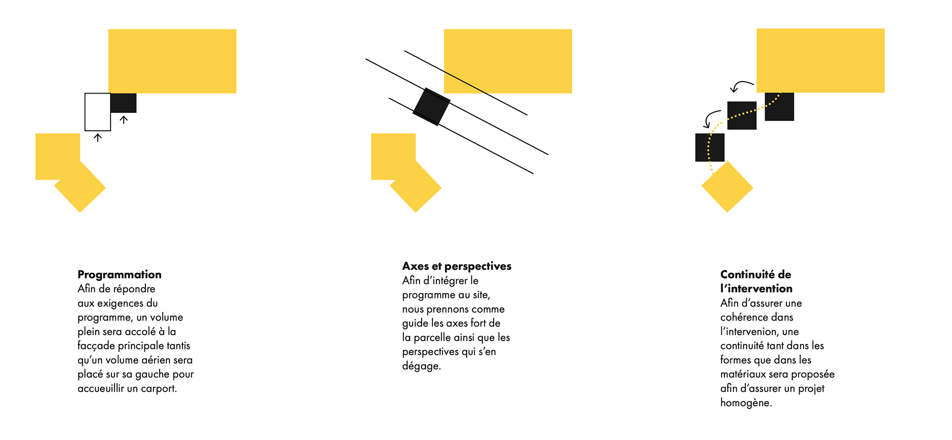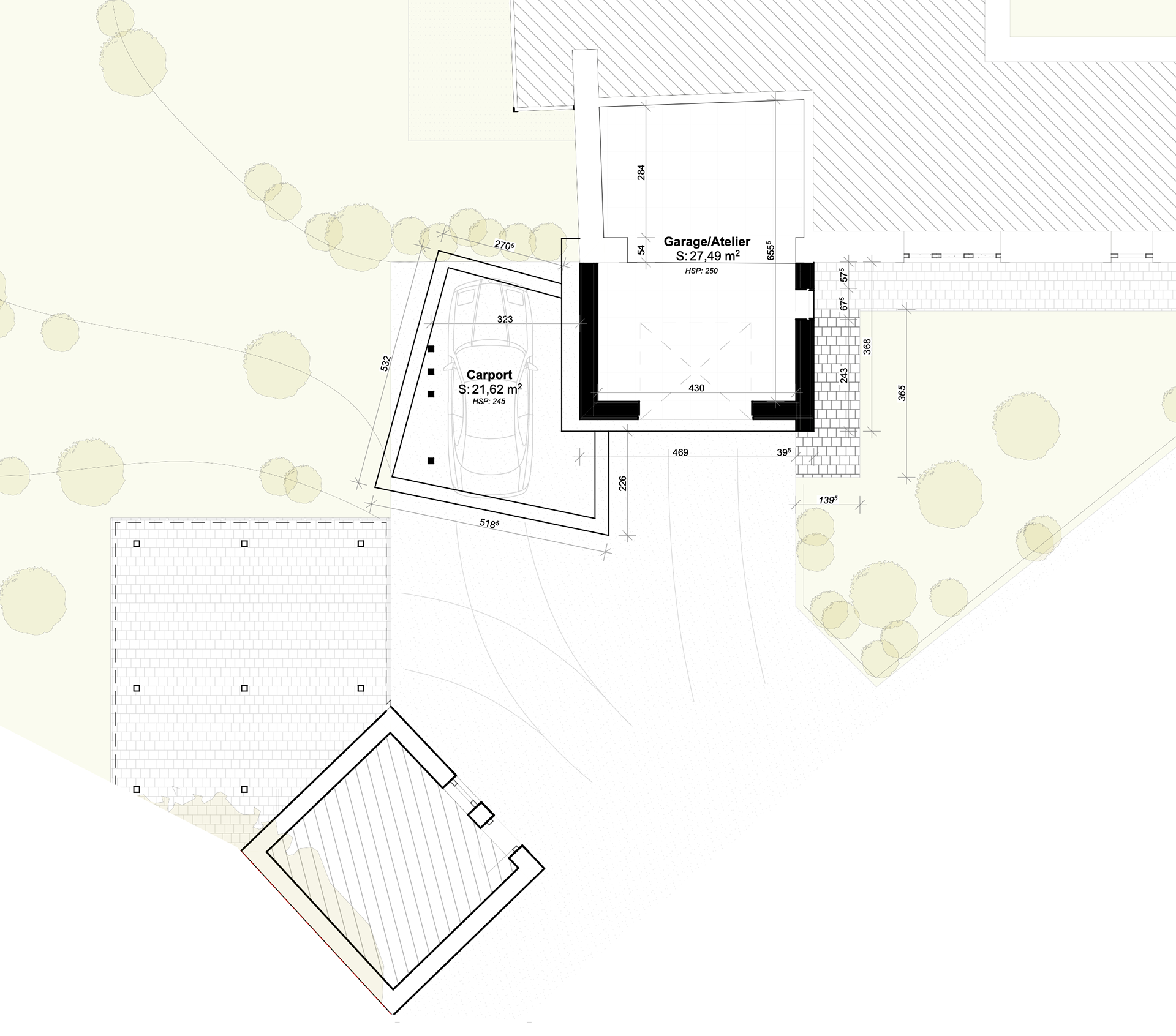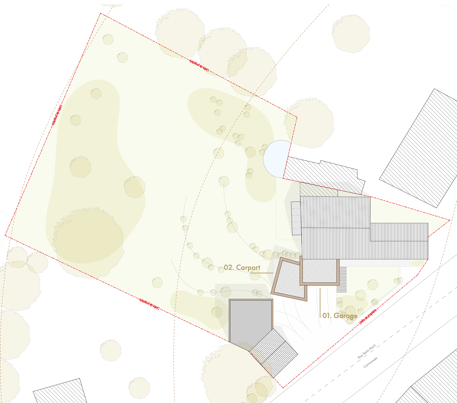 Présentation: Projet d'extension d'une habitation pour un garage et un carport. L'enjeux est de maintenir un concept aérien tout en répondant aux contraintes spatiales des dispositifs et assurant une continuité avec les volumes secondaires déja présent.